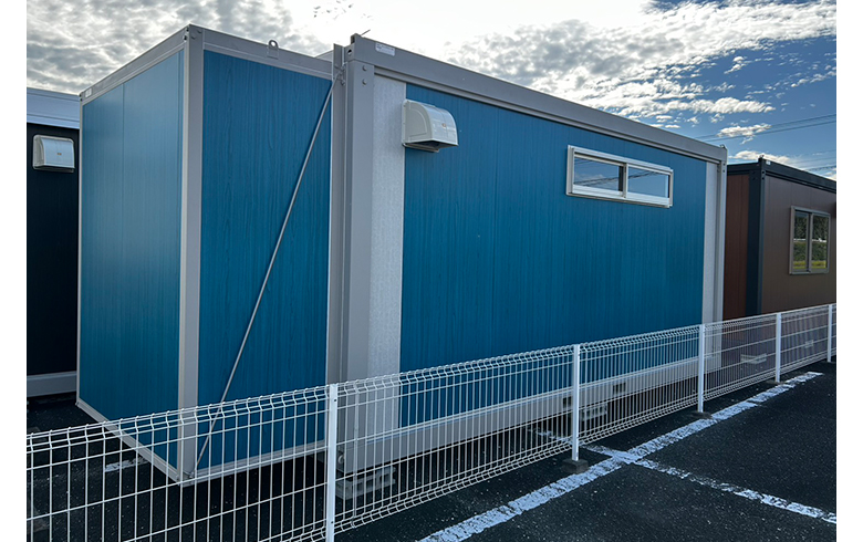 鼻隠し(面)| 本体税別価格 | 186.6万円→1,728,000円(税込1,900,800円)※7.4%OFF | 坪数 | 3.8坪 | 寸法外寸 | 幅:5400mm+900mm×奥行き:2300mm×高さ:2600mm | 室内内寸 | 幅:5250mm×奥行き:2150mm×高さ:2320mm | 用途 | 事務所・店舗・その他 | 展示場所 | 福岡飯塚展示場 | 店長のコメント | U-prefabオリジナルユニットハウス A-space AC-4型(7.6畳)が入荷しました。 木目柄ブルーのパネルの外壁と、フレームはホワイト色を採用し、目を惹くとても明るいハウスに仕上がっております。 落ち着いた雰囲気でおしゃれなユニットハウスです。 出入口は住宅用のリジェーロαを採用し、窓網戸付きの天窓と掃き出し窓を1面ずつ装備しています。 また、スペースBOXを付属したハウスになります。 設置後、電気をつなげばすぐにご利用になれます。 全て新品の部材を使用しておりますが、製作・運搬・設置時に小キズや凹み等つく場合がございますので、アウトレット品扱いとしています。 頑丈な鉄骨フレームを採用しているため、ご希望で2階建てにすることも可能です。 展示品のため、受注後最短10日程度で即納可能な商品です。 値引前価格にて、ドア・窓の位置やカラーを変更したオーダー品を、受注後約1.5ヶ月で製作可能です。 掲載価格は商品代金のみとなり、別途運搬費・設置工事費等が必要になります。 福岡飯塚展示場でご覧いただけます。是非一度お越しください。 ※こちらの商品は、山口県、九州エリアのお客様限定とさせていただきます。 |