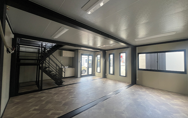 用途 | 事務所・休憩室 | 展示場所 | 大阪堺第2展示場 | 店長のコメント | U-prefabオリジナルユニットハウス A-space AC-12型(22.6畳)2階建てが入荷しました。 新たに内階段を採用し、外壁パネルは木目柄のブラックとダークブラウンを使用。 丈夫で美しい天然木のウリン材を使用した玄関デッキと踏み台を備え付け、精悍な印象を兼ね備えたハウスに仕上げました。 室内にはミニキッチンもつけており、すぐに事務所等にお使いいただける仕様になっております。 全て新品の部材を使用しておりますが、製作・運搬・設置時に小キズや凹み等つく場合がございますので、アウトレット品扱いとしています。 展示品のため、受注後最短10日程度で即納可能な商品です。 値引前価格にて、ドア・窓の位置やカラーを変更したオーダー品を、受注後約1.5ヶ月で製作可能です。 掲載価格は商品代金のみとなり、別途運搬費・設置工事費等が必要になります。 大阪堺第2展示場でご覧いただけます。是非一度お越しください。 |